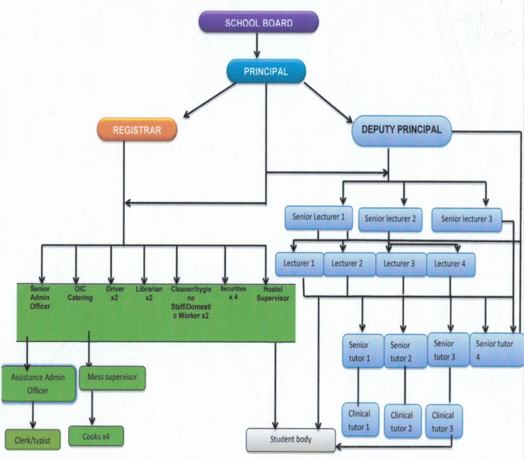 Each school has Departmental Board, which is made up of the Principal, Deputy Principal, the Registrar, and the chairperson of other committees in the institution who have direct link to the Academic Board. The Departmental Board is responsible for student discipline, staff development, resource allocations such as library books and computers. This body further makes/executes decisions on any administrative matters of the institution. Some tasks include: preparing budgets, staff appraisals, maintenance of the physical resources of the institution, student selections etc. The flow chart below depicts the organization and the administration within the college that relates to academic matters.
